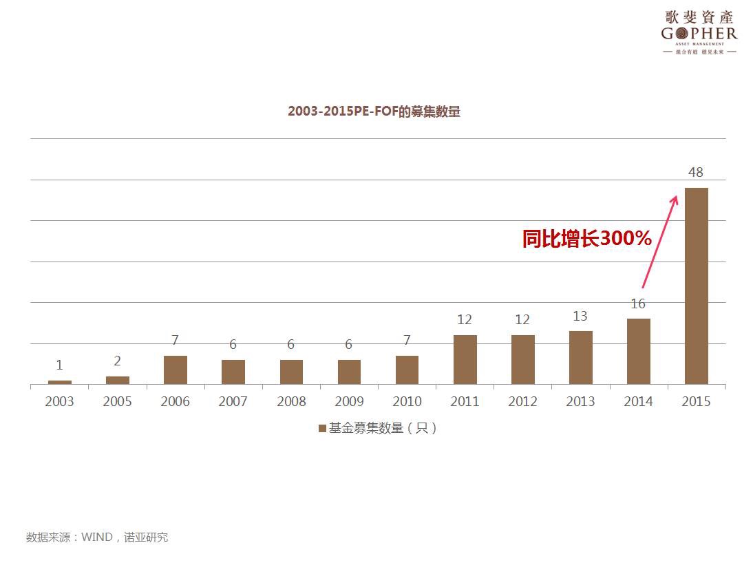 2003年第一只外資PE-FOF成立以來,PE-FOF的募集數(shù)量平穩(wěn)發(fā)展,年復(fù)合增速38.1%。而2015年,迎來了PE-FOF募集的大爆發(fā),2015年完成募集的PE-FOF同比增長300%。