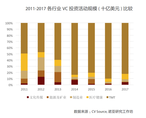 VC投資方面,無(wú)論是從投資數(shù)量還是投資規(guī)模上看,TMT依然獨(dú)領(lǐng)風(fēng)騷。能源及礦業(yè)投資仍然逐步走低,文化傳媒、制造業(yè)和醫(yī)療健康行業(yè)投資穩(wěn)步提升。