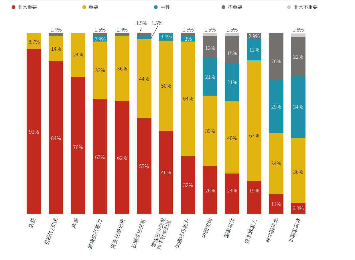 CIO篩選外包服務(wù)商的時(shí)候信任最重要,最看重的是信任、品牌 、保密性,其后才是優(yōu)秀的投資業(yè)績(jī)。選擇金融服務(wù)提供商時(shí),在各種標(biāo)準(zhǔn)對(duì)選擇金融服務(wù)提供商的重要性方面,家族表示信任、機(jī)密性 、安全和聲譽(yù)是最關(guān)鍵的考慮因素,分別有91%、84%和76%的家族表示這些因素非常重要。