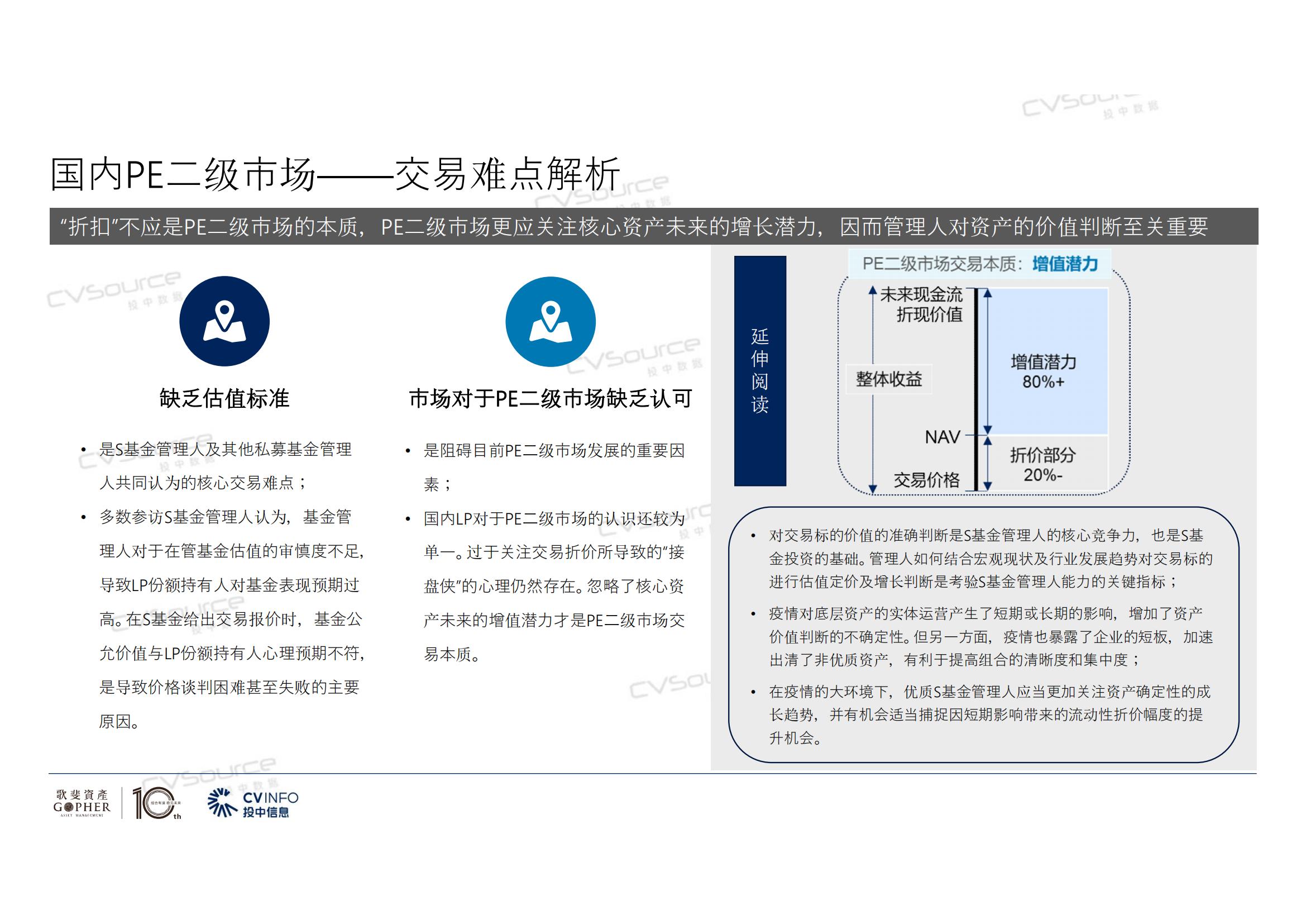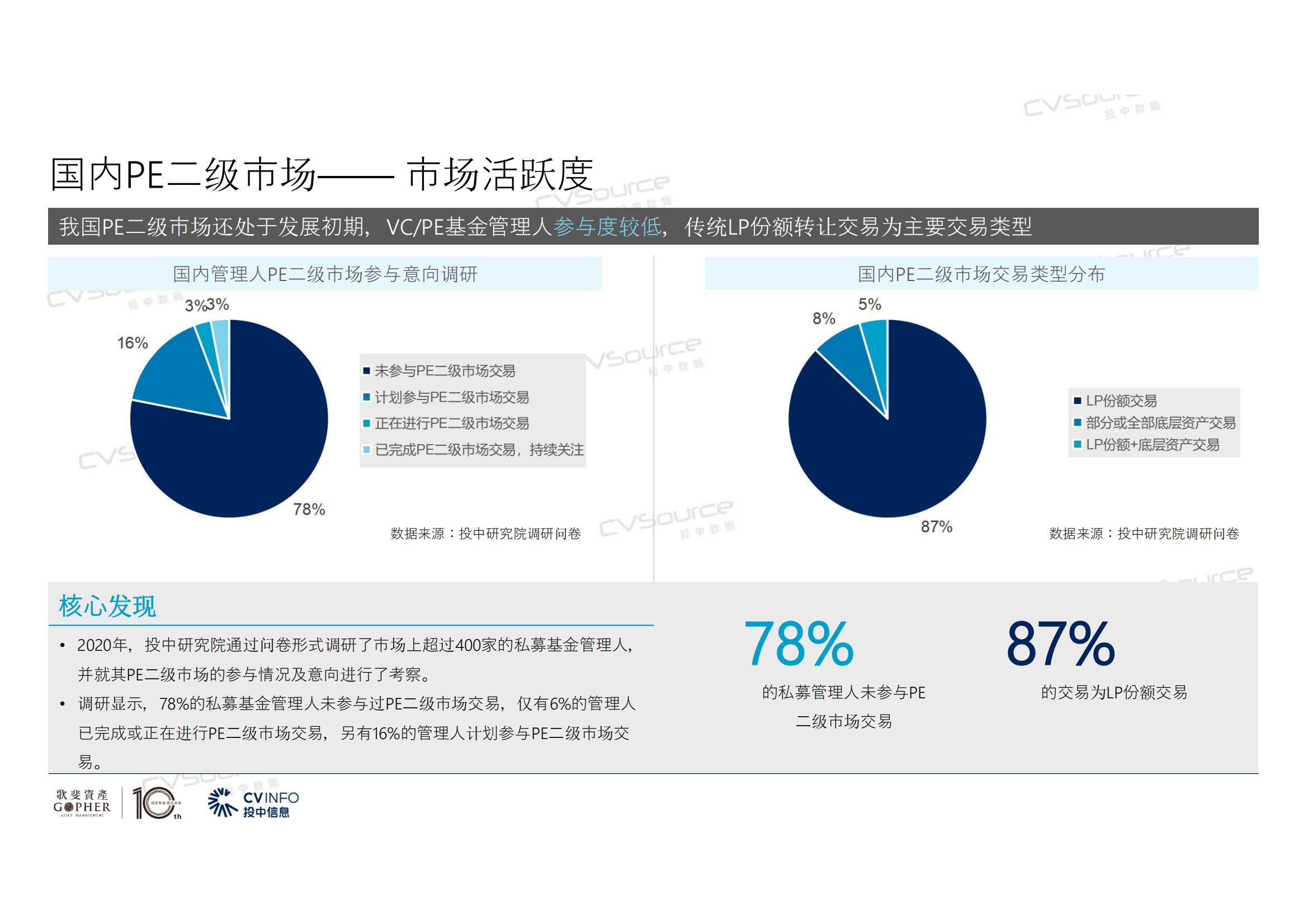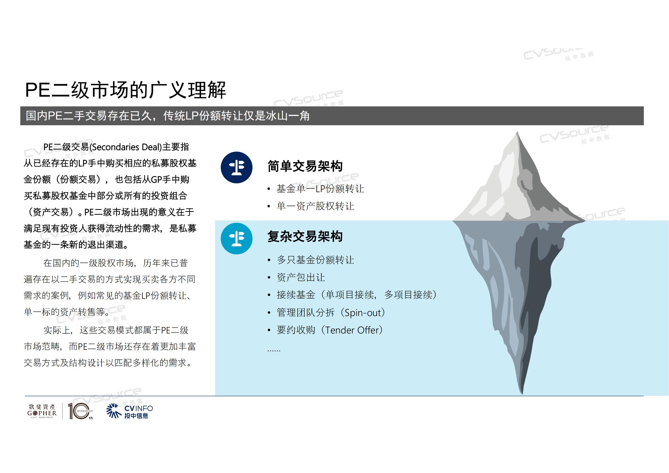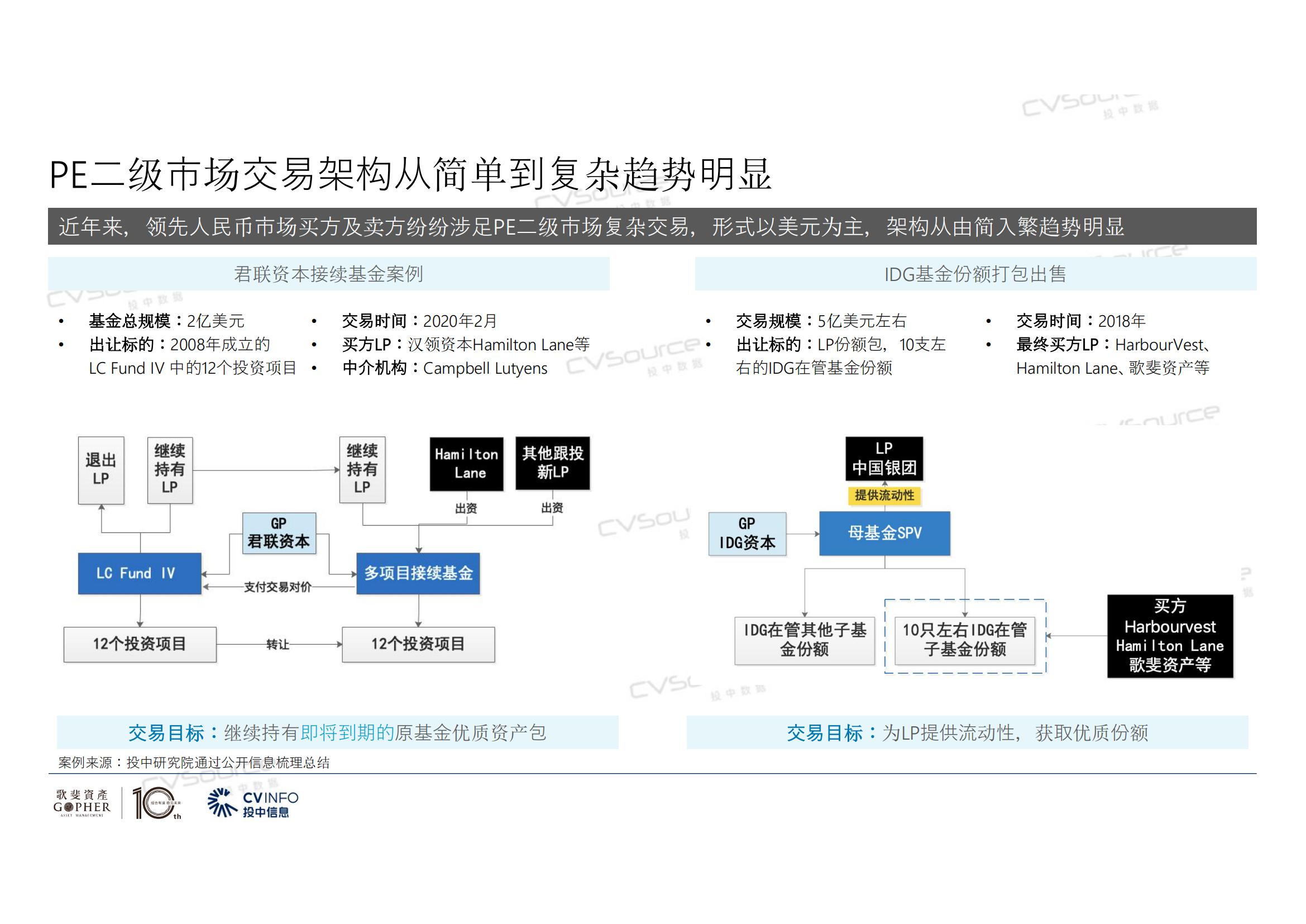 值國內(nèi)疫情逐漸平穩(wěn)之際,歌斐資產(chǎn)與投中研究院在深度調(diào)研國內(nèi)PE二級市場頭部機構(gòu)的基礎(chǔ)上,共同發(fā)布《在不確定的時代尋找確定性——中國PE二級市場2020年發(fā)展趨勢及展望》。此份報告的研究范圍由簡單交易架構(gòu)擴展至復雜交易架構(gòu)(如:接續(xù)基金、資產(chǎn)包轉(zhuǎn)讓等)以順應我國市場交易結(jié)構(gòu)由簡入繁的發(fā)展趨勢。報告從PE二級市場買賣雙方發(fā)展態(tài)勢、投資邏輯、實操流程、交易案例等角度進行深入調(diào)研及分析,研判后疫情時代中國PE二級市場的發(fā)展趨勢及機遇。