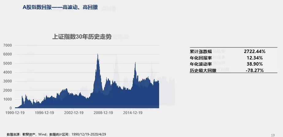 歌斐資產(chǎn)統(tǒng)計(jì)上證指數(shù)30年來(lái)歷史走勢(shì)數(shù)據(jù)發(fā)現(xiàn),30年來(lái)上證指數(shù)年化回報(bào)率超過(guò)12%,但年化波動(dòng)率接近39%,歷史最大回撤達(dá)到-78%,呈現(xiàn)出高波動(dòng)、高回撤的特性。很有可能一不小心在高點(diǎn)進(jìn)入,就容易被套牢好幾年。