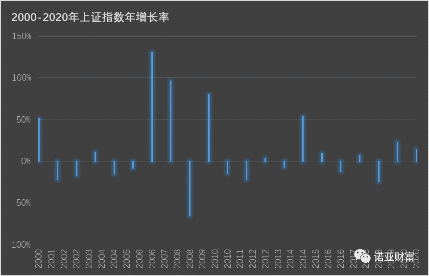 以上證指數(shù)為例,最近20年來其每年的增長率起起伏伏,雖然總體上是持續(xù)斜向上的走勢,但至今為止2007年的6124點(diǎn)、2015年的5178點(diǎn),仍是不可逾越的高山,當(dāng)前上證指數(shù)只有3600點(diǎn)左右。