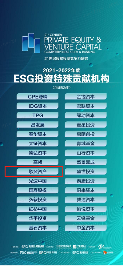 導(dǎo)語:在實現(xiàn)中國“2030 年碳達(dá)峰、2060 年碳中和”的目標(biāo)下,綠色低碳成為各個行業(yè)的必然要求和發(fā)展趨勢。9月28日,21世紀(jì)經(jīng)濟(jì)報道、21世紀(jì)創(chuàng)投研究院在北京舉辦2022年秋季閉門研討會——“踐行‘碳中和’:股權(quán)投資策略與實踐”,并在會上重磅發(fā)布了“2021-2022年度ESG投資特殊貢獻(xiàn)機(jī)構(gòu)”研究案例。歌斐資產(chǎn)深耕ESG領(lǐng)域,深度挖掘ESG投資趨勢,積極建立完善的ESG制度體系、健全ESG組織架構(gòu),以打造踐行ESG投資理念,在眾多參選機(jī)構(gòu)中優(yōu)勢突出,榜上有名。
